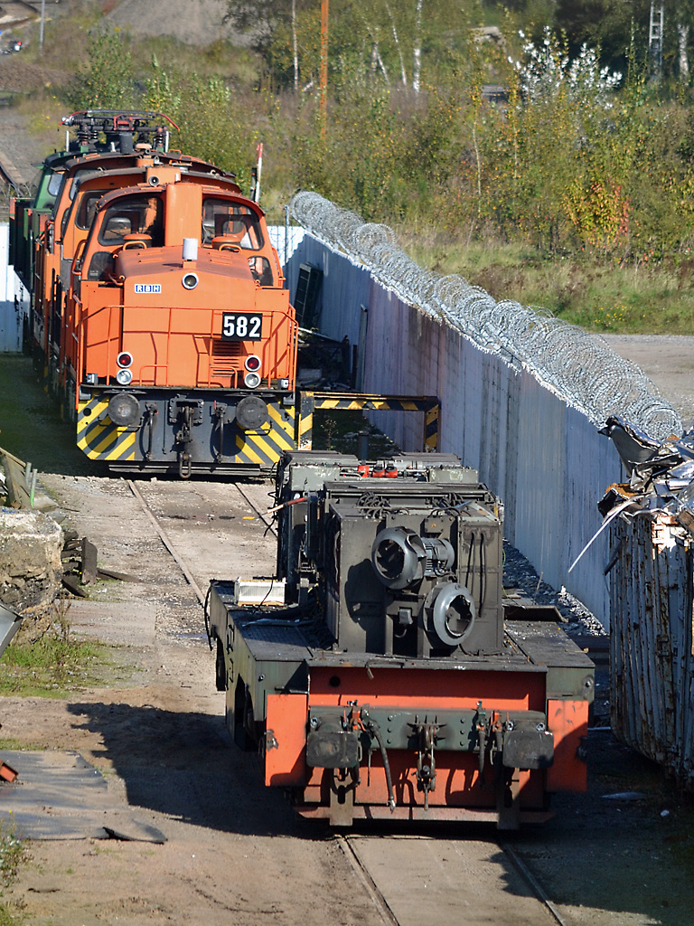 | Bild 74 : Eine „Premiere“ beim Bender: Verschrottung ehemaliger Zechenbahnloks der RBH. Am 19.09.2014 wurden von der MEG 218 (UIC: 1275 218), z. Zt Leihlok bei der RBH, folgende Loks nach Opladen zur Verschrottung überstellt: 017 (Elok) , 643 , 576 , 582, 450, 004 (Ellok). Dabei gab es die zweite „Premiere“: Die Schlußlok RBH 004 fuhr komplett aufgerüstet als Bremslok bis nach Opladen, wo sie voll funktionfähig in den Schrott wanderte ! Auf dem Bild warten 155 042 und 155 268 am Abend des 22.09.2014 zusammen mit den 6 RBH Loks auf ihr sicheres Ende. Bild 75: Kein schöner Anblick: Die Überreste der zerlegten 155 042 am Abend des 23.09.2014 beim Bender. Der Rahmen ist bereits zerteilt, so dass am Folgetag nur noch die „handlichen Stücke“ von den Drehgestellen gehoben werden müssen. |