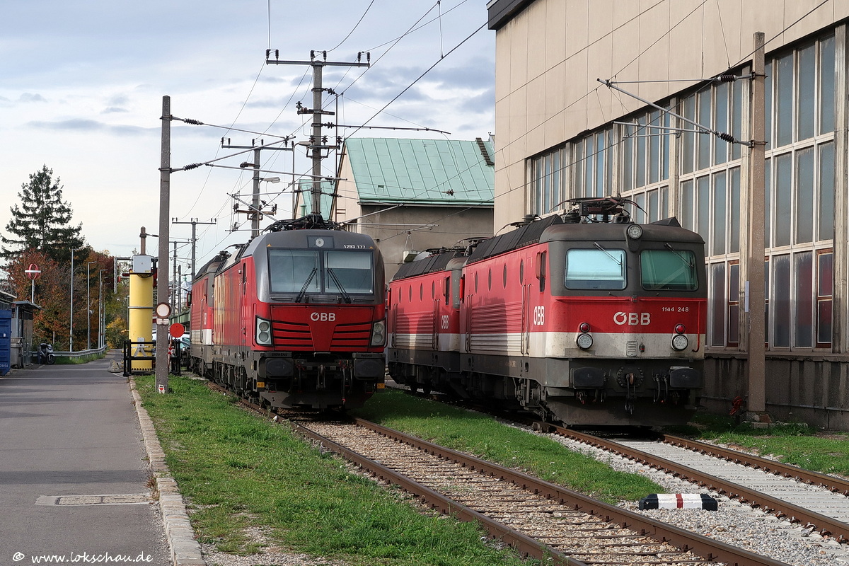 In der Betriebswerkstätte Wien West hatten wir Gelegenheit, sowohl einen neuen CRRC-WestBahn-Triebzug als auch einen neuen Stadler-Doppelstock-RailJet zu besichtigen. Leider gab es ein Fotografierverbot, so dass ich hier davon nichts zeigen kann. Aber diese abgestellten Lokomotiven 1293 177 und 1144 248 konnten abgelichtet werden. (30.10.25)