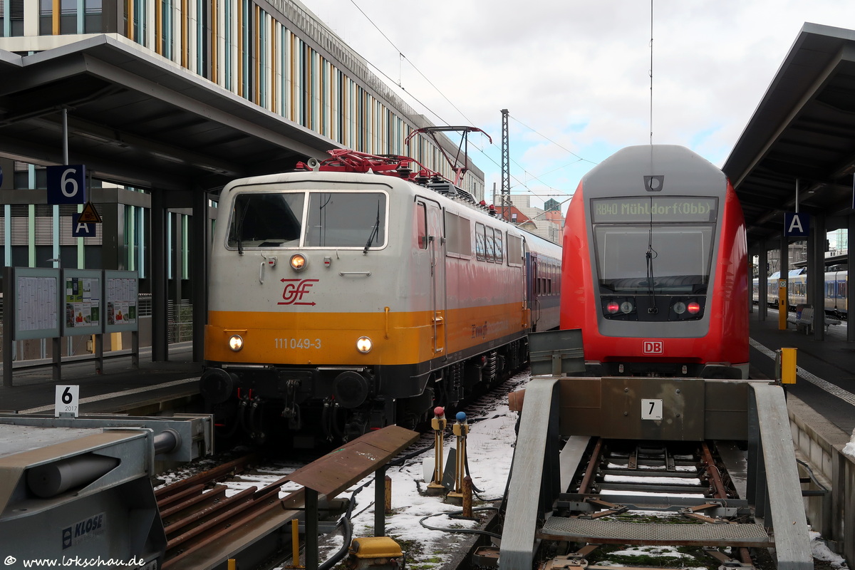 Die GfF aus Crailsheim spendierte ihrer 111 049 eine Lackierung in der so genannten Lufthansa-Farbgebung, den die Lok ab Mitte 1990 etwa ein Jahr lang getragen hatte. Am 09.01.26 steht sie mit ihrem Sonderzug in Gleis 6 des Münchner Hbf und wartet darauf, dass das Catering des Zuges abgeschlossen wird.