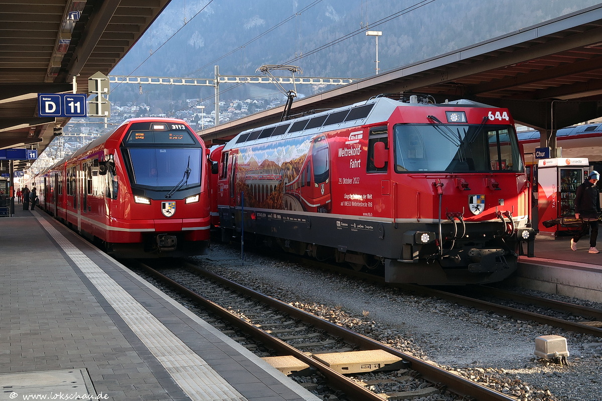 Zum Jahreswechsel 2025/26 war ich in der Schweiz als Reiseleiter unterwegs. Diese Aufnahme aus Chur hat es nicht in meinen Bericht (siehe hier) geschafft. Ich möchte aber einen Capricornzug zeigen, die alle zusammen 2022 den Weltrekordzug bildeten. Hier steht ABe3113 neben Ge4/4III 644 am 31.12.25 in Chur.