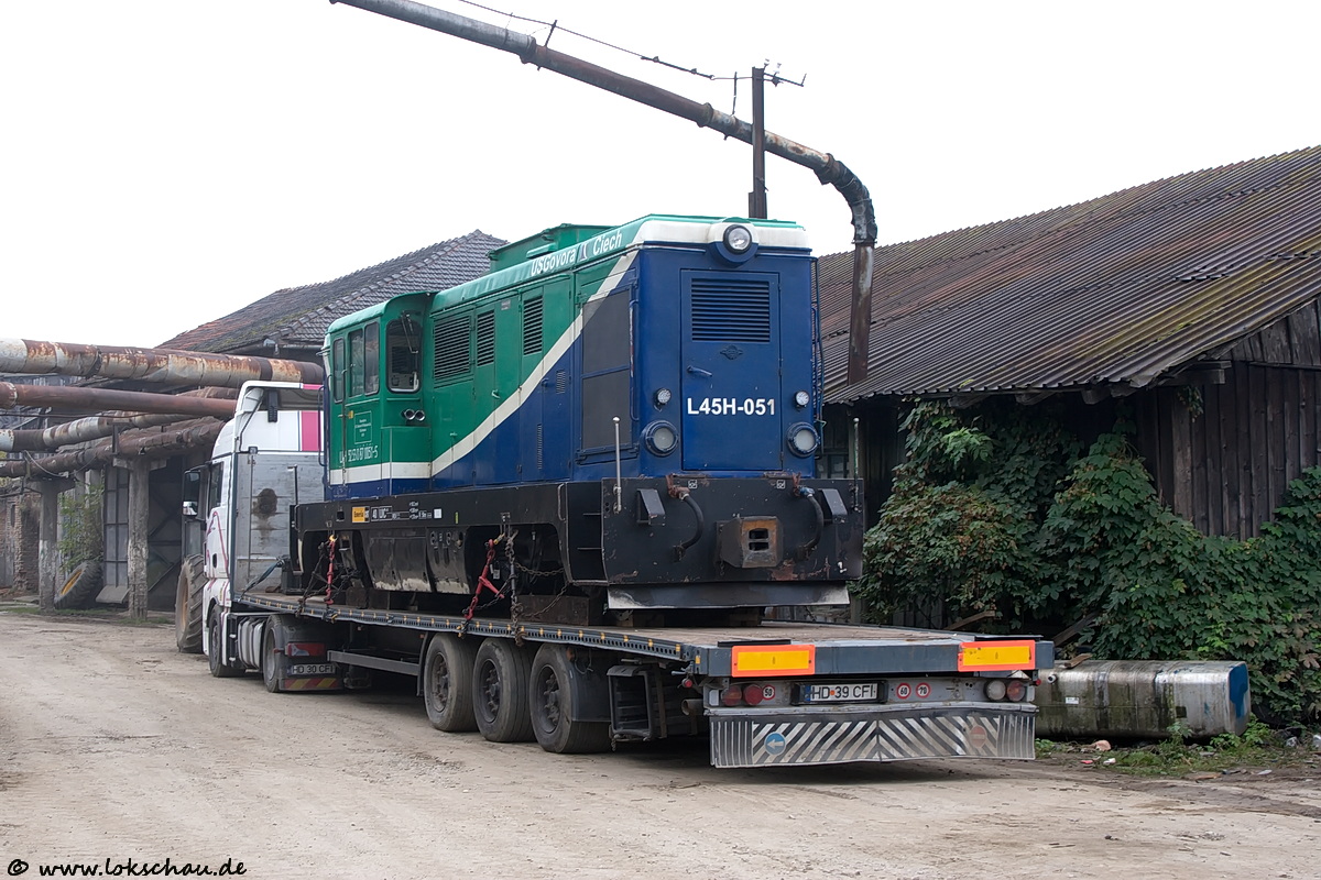 Am vorletzten Tag besuchten wir die Werkstätten der Calea Ferata Ingusta S.R.L. in Criscior. Hier hat die Firmengruppe von Georg Hocevar ihren Sitz. Erneut war der Chef vor Ort und zeigte uns sein Reich. Auch in die Werkhallen konnten wir einen Blick werfen. Dort wurden u.a. gerade Flachwagen für die Elfenbeinküste aufgearbeitet. Auch zahlreiche Lok der Bauart L45H waren vorhanden. Wie zum Beispiel hier die L45H-051 auf ihrem Laster. Sie scheint gerade angekommen zu sein, denn am Nachmittag stand sie woanders im Werk.