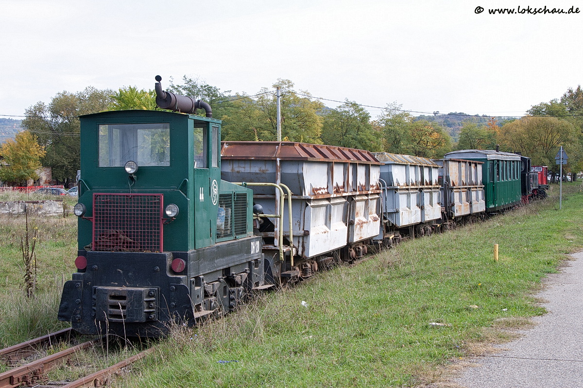Zum Programm sollte auch eine Fahrt mit einem Dampflok auf der Anschlussbahn Brad - Criscior gehören. Dummerweise musste man beim Anheizen feststellen, dass ein Einströmrohr gerissen war. Eine Notlösung musste her. Und die war ein Vorspann- und Schiebebetrieb mit Diesellok. An den Fotostellen hängte man die Vorspann ab und die Schublok war meist nicht zu sehen. So merkte man kaum, dass die Dampflok wieder kalt gemacht werden musste. Hier der Schluss des Zuges am Bahnhof in Brad mit Lok 44. Vorn rangiert noch die rote Vorspannlok.