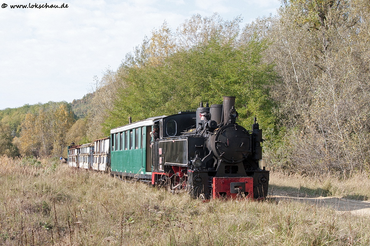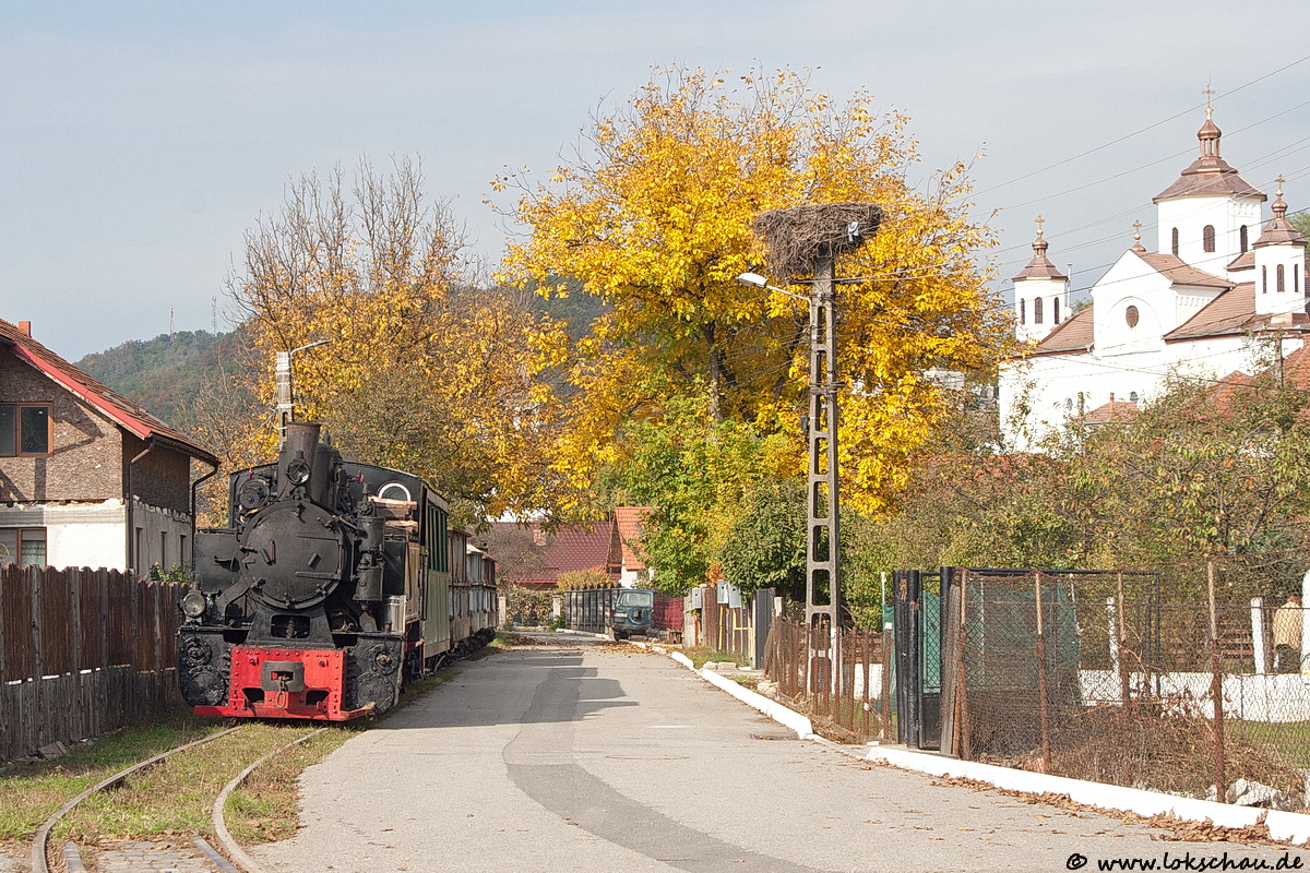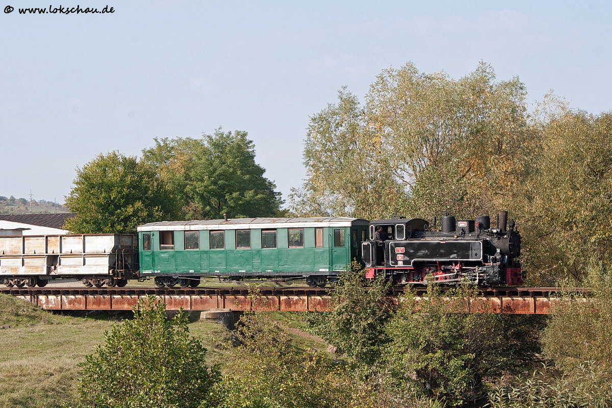 Die erste Fotostelle war diese Brücke. Da die Schublok nicht gekuppelt war, rollte unser Zug hinter der Brücke ein Stückchen ganz alleine dahein. Die Dampfok ist die CFI Lok 5, gebaut 1957 bei Reșița und hier nach Brad geliefert. Zwischenzeitlich auch einmal bei Steyrtalbahn eingesetzt, hat sie wohl nie eine rumänische Loknummer getragen.