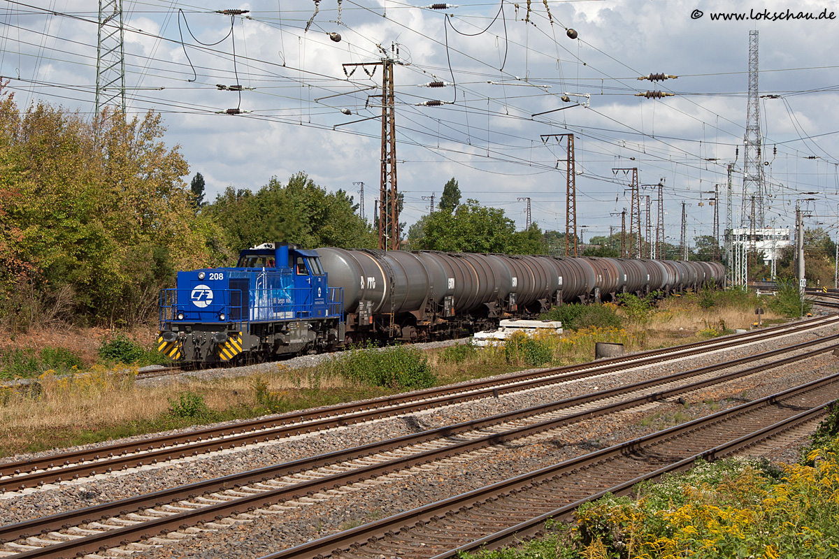 Für Rangierarbeiten setzt die Werkbahn "InfraLeuna" unter anderem G1206 ein. Hier die Lok 208 (UIC-Nummer: 1275 011) mit einem Kesselzug auf dem Ausziehgleis.