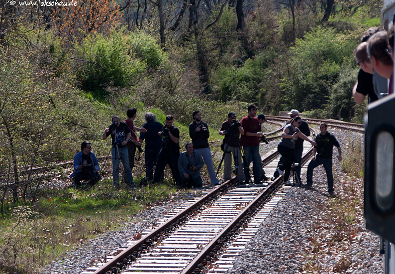 Da wir die Bergstrecke an einem Wochenende befuhren, ließen es sich die griechischen Eisenbahnfreunde nicht nehmen, dem Ereignis beizuwohnen. Im Bahnhof von Leontari gibt es ein beliebtes Motiv, so dass eine Fotolinie notwendig war. Schön sieht man auch den Top-Zustand der Gleisanlagen...