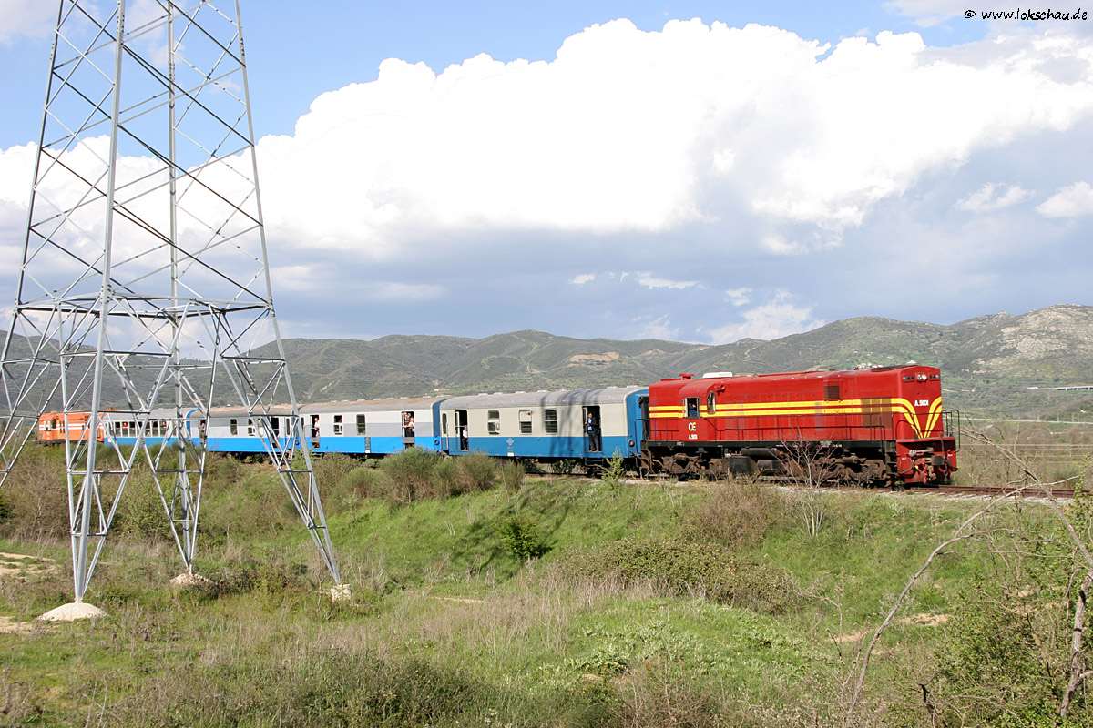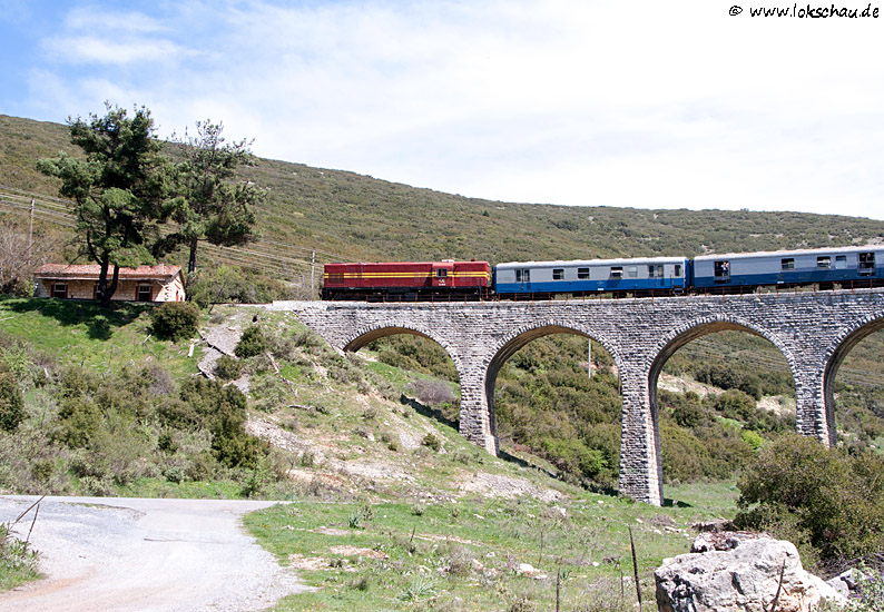 Nach einem weiteren etwas umständlichen Rangiermanöver, hing die A.9101 hinten am Zug. Dann ging es weiter Richtung Megalopoli. Hier wieder an der Brücke bei Mamari. Für die 30 Kilometer bis zum Hauptort der Hochebene wird der Zug noch eine geschlagene Stunde benötigen.
