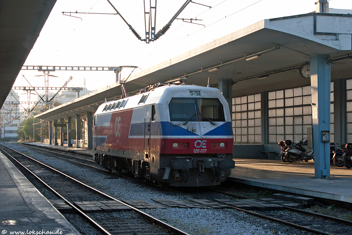 Da ds Hotel gleich um die Ecke am Bahnhof lag, nutzte ich die Zeit nach dem Frühstück für einen Abstecher. Am Gleis 1 stand um 8:30 Uhr HellasSprinter 120 017, der offenbar mit einem Nachtzug eingetroffen war, von dem selbst aber nichts mehr zu sehen war. Nachdem sich einige Minuten nichts tat, lief ich mal Richtung Prellbock, denn dort stand eine weitere 120...
