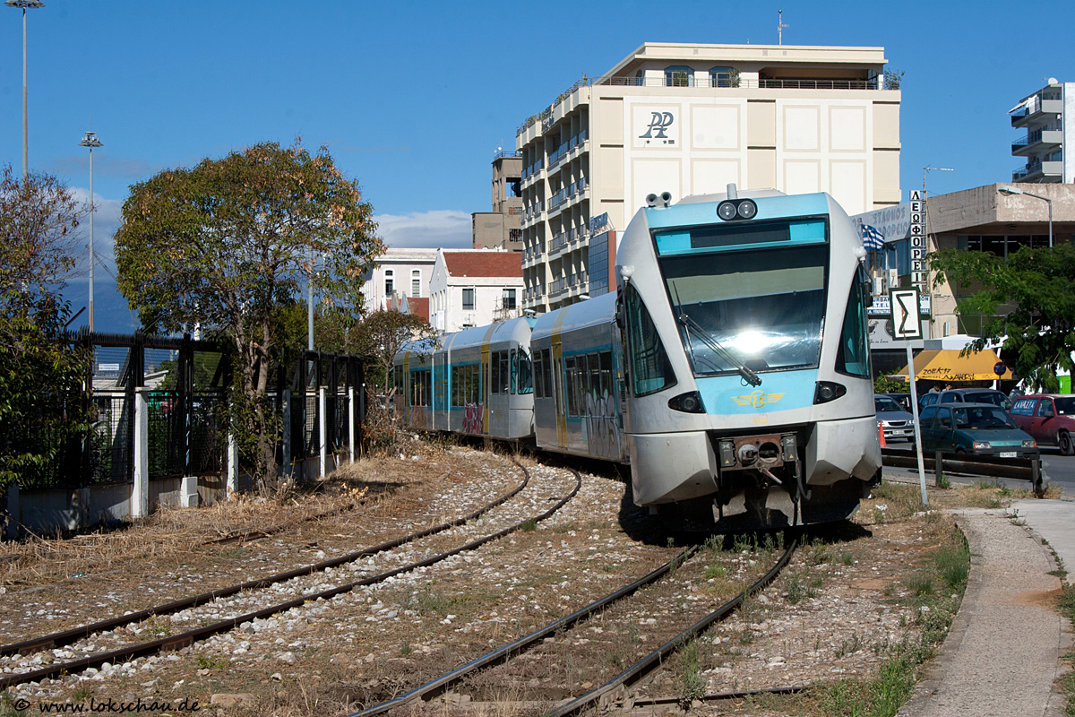 In Patras gibt es weiterhin einen "S-Bahn"-Inselbetrieb auf 1000mm. Zwei Triebwagen pendeln im Stundentakt zwischen Agh. Vassilios (im Osten) und Agh. Andreas (im Westen) durch Patras. Wir sehen die Garnitur 4303/4403 (vorn) und 4312/4412 (hinten) am Streckenende in Agh. Vassilios, wohin uns unser Bus von Diakopto her gebracht hatte. Zwangsweise, da die alten Gleise bereits entfernt sind.