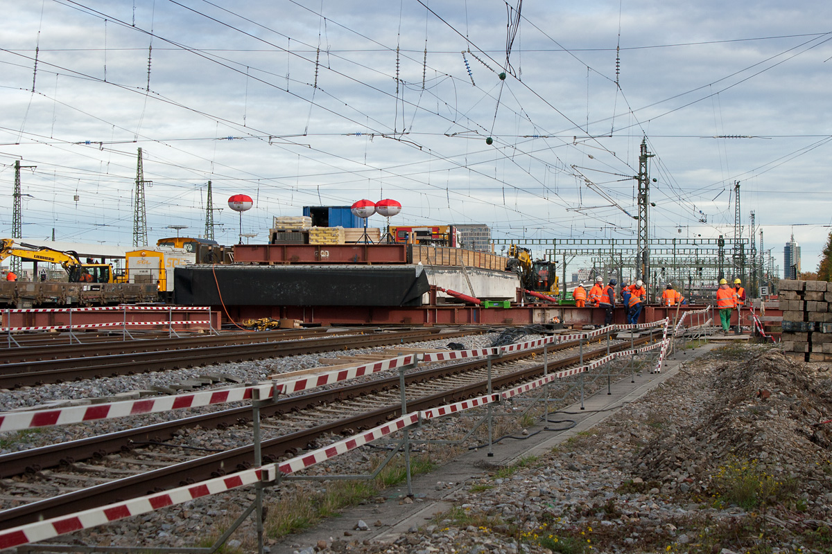 Von der Südseite der Gleise hatte man diesen Blick. Der Überbau war neben den letzten 3 Gleisen am Südrand des Gleiskörpers hergestellt worden und wurde nun quer über alle Gleis verschoben. Mittels der grünen Pratzen ging es immer etwa einen Meter vorwärts. Hier sind sie voll ausgefahren, der Verschub ist erst einmal beendet.